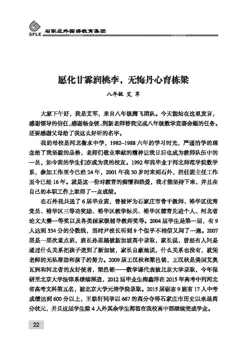 愿化甘霖润桃李,无悔丹心育栋梁 八年级 艾军