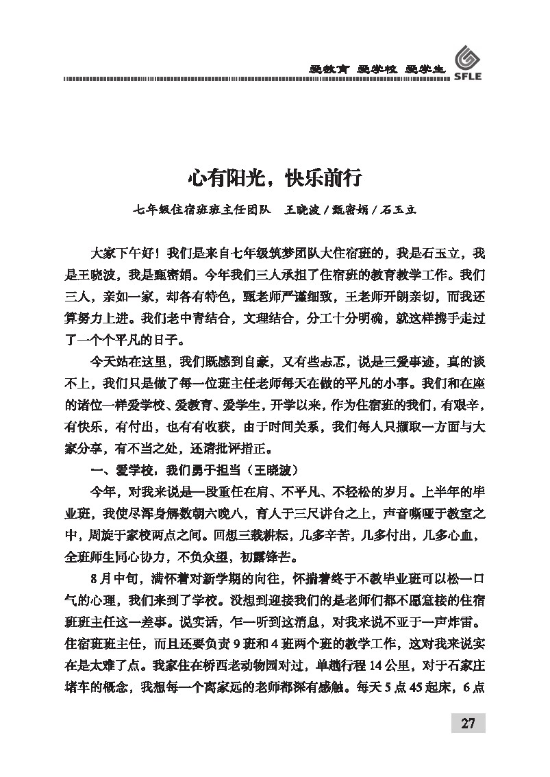 心有阳光 快乐前行 七年级住宿班班主任 王晓波/甄密娟/石玉立
