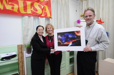 随后,双方在《假如幸福的话你就拍拍手》的音乐声中互赠了礼物。石家庄外国语学校赠送的中国画《五福临门》,画中的五只老虎线条细致,疏密有序,构图合理,栩栩如生,动静相宜,表达了美好的祝福。美国代表团赠送的《桥》表达了美好的心愿,愿双方以音乐为桥,架起沟通的桥梁,增进中美两国人民的友好情谊。热情好客的石家庄外国语学校的师生还为代表团成员准备了具有浓郁中国特色的宫灯、包装精美的笔记本等小礼物,希望美国学生记录下在石家庄、在学校美好而难忘的日子。