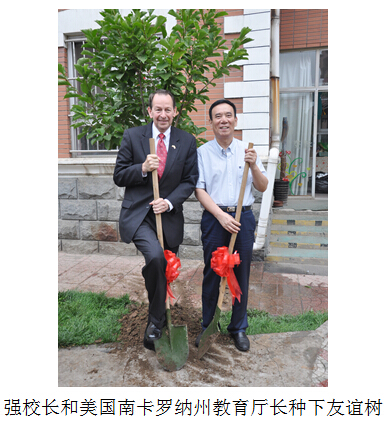 欢迎仪式结束后,强校长和美国教育厅长种下了象征友谊的玉兰树。随后,李书记带领访问团一行参观学校,每到一处,都向来宾详细介绍教室的功能、课程的设置与研发情况、学生取得得优异成绩。作为一名退伍的伞兵,厅长ZAIS先生对我们的航模教室表现出很浓的兴趣。在机器人教室、在机械加工教室得知我们这些课程的教材、授课内容、考核标准等都是由任课老师团队制定的校本教程时,称赞开发校本课程的教师都是不起的老师。在艺术馆和体育馆,厅长先生对于我们对学生的体育与艺术教育的重视和我们让学生选遍各个领域的课程、然后在确定自己的真正兴趣所在的做法尤为赞赏。各位来宾听到艺术课成为初中学生的必修课时,Robert说:“美国学生在学校一般只选择一种艺术课,而贵校让学生体验这么多艺术课,真的很棒。” Susan说:“感觉像一座大学,有这么多的学生,这么多的教学资源,烹饪课锻炼了小孩子做家务的能力。我也很喜欢中国的书法、二胡等传统文化。”