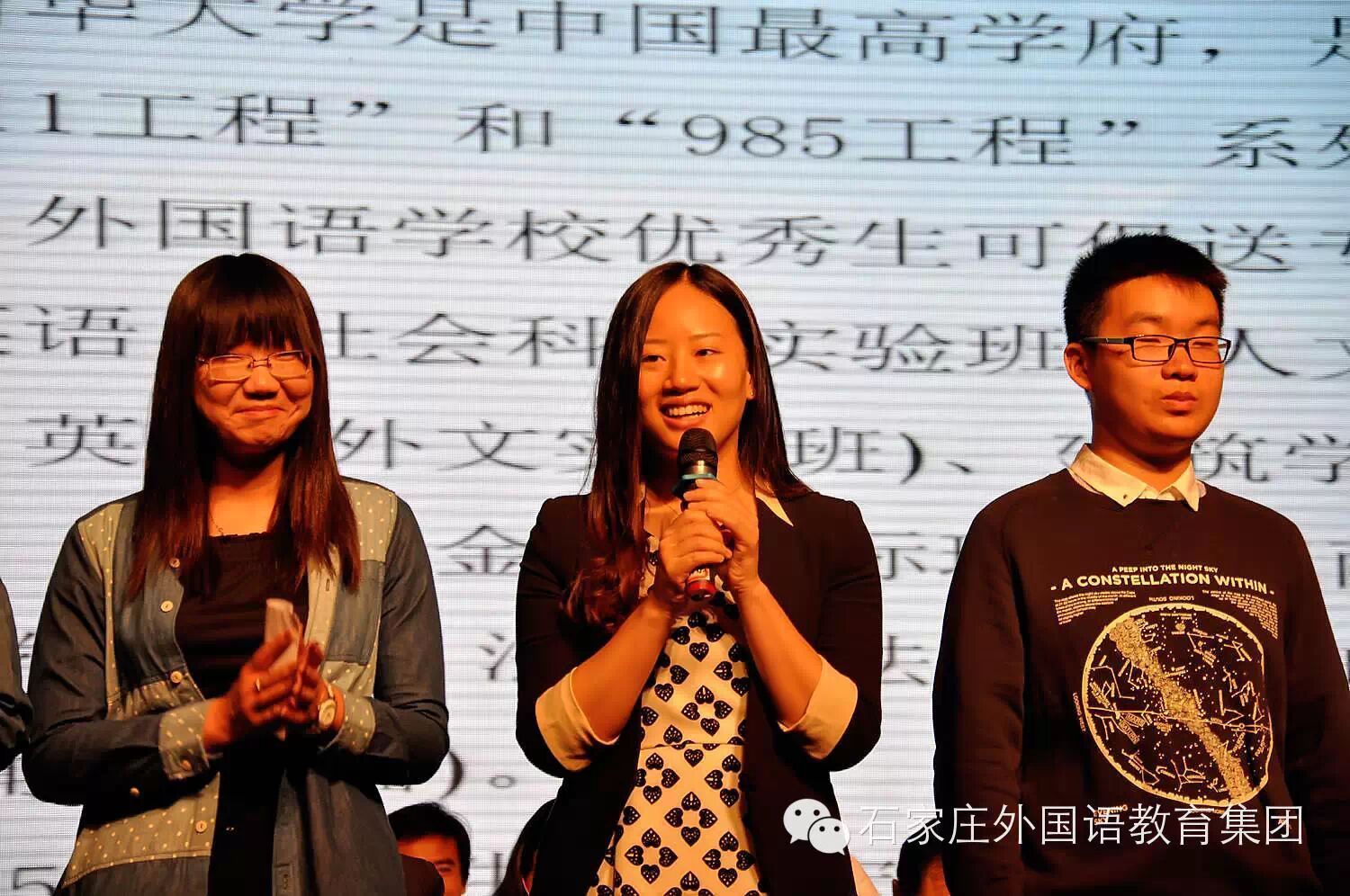 会议由初中部马丽君主任主持,高中部主管校长殷玉芳致欢迎词,接着来自清华大学、北京外国语大学的代表讲话。领导和专家们的讲话让在座的学生和家长看到,中学和大学虽然是两个不同的学习阶段,但却是一个有机的整体,更了解到石外集团的办学优势及国内重点名校的办学理念。