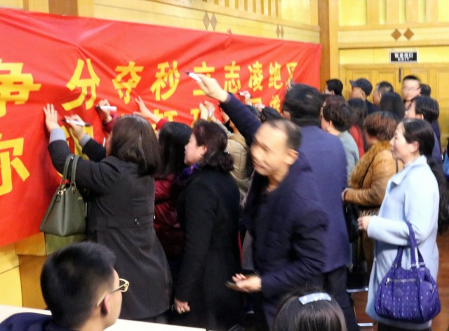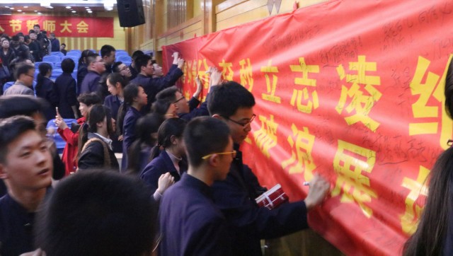 老师、家长和同学们纷纷在宣誓条幅上签下自己的名字,写下了对高考胜利的无限希望。