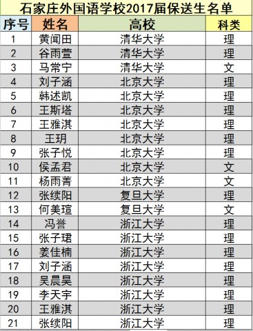 石家庄外国语学校2017届保送工作顺利结束,感谢大家一直以来对石外保送工作的关注,录取情况如下: