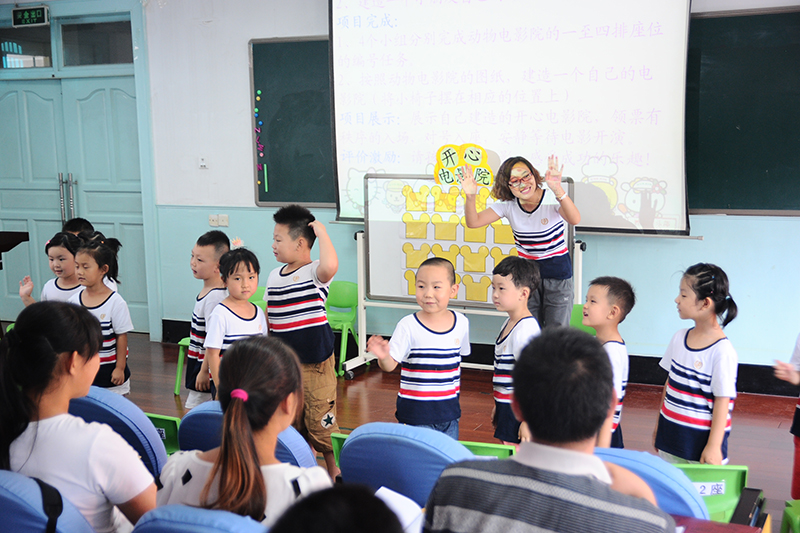 队员们到队会准备室进行40分钟的紧张准备之际,集团幼儿园大班的孩子们在宋老师的带领下,为参加培训的山区教师带来了一节丰富精彩的活动课——开心电影院。孩子们首先通过平面对电影院座位分布等进行认知了解,之后分小组按照平面图建起了自己的开心电影院,并邀请在座的老师们一起观看精彩预告片。孩子们利用空间和序数的相关经验,解决了电影院排座位的情境问题,并在游戏中体验相互帮助、群策群力的乐趣。本次活动充分展示了“把活动还给孩子”、“教师退位”、“永远不要低估孩子能力”等四环节理念,给来宾留下了深刻的印象。