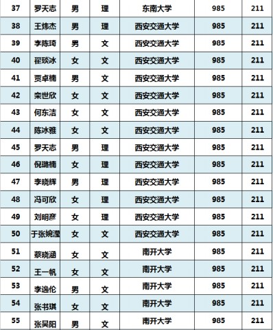 其中,北京大学拟录取4人、清华大学拟录取3人、对外经济贸易大学拟录取18人、西安交通大学拟录取13人、华南理工大学拟录取12人、上海外国语大学拟录取12人、北京外国语大学拟录取11人、上海交通大学拟录取11人、浙江大学拟录取9人、南开大学拟录取7人、大连理工大学拟录取7人、厦门大学拟录取6人、武汉大学拟录取5人、北京理工大学拟录取5人、华东师范大学拟录取5人、天津大学拟录取4人、上海财经大学拟录取4人、南京航空航天大学拟录取3人、外交学院拟录取3人、南京大学拟录取3人、哈尔滨工业大学拟录取3人、中国人民大学拟录取3人、复旦大学拟录取2人、山东大学拟录取2人、东南大学拟录取2人、北京航空航天大学拟录取2人、国际关系学院拟录取2人、北京科技大学拟录取2人、中山大学拟录取1人、北京语言大学拟录取1人。