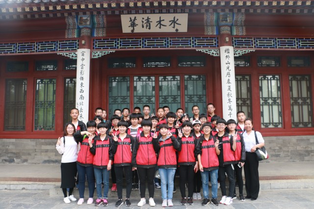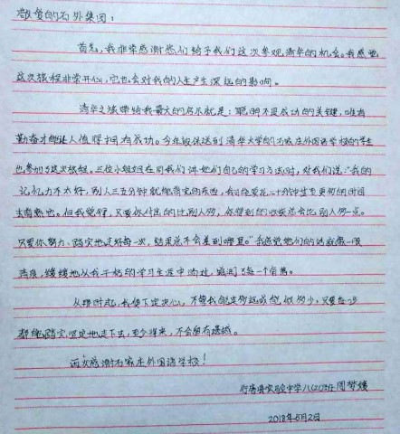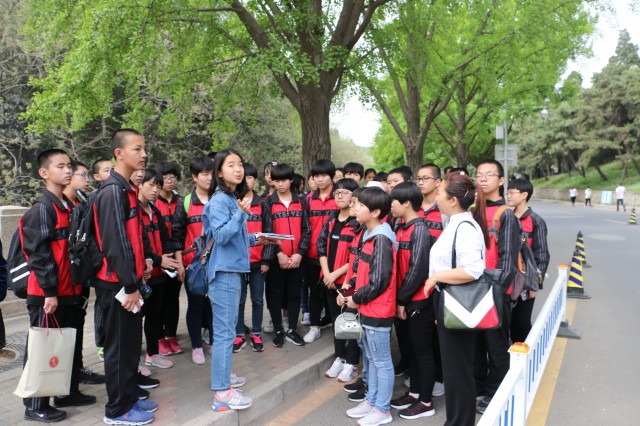 在今年五一小长假期间,石家庄外国语教育集团2017届被保送到清华大学的谷雨萱同学带领集团山区教育精准扶贫项目学校行唐实验中学的32名学生来到清华大学参观。