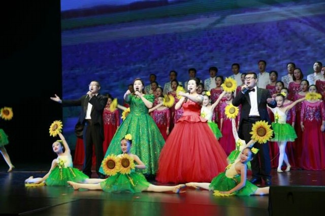 音乐教师李宝莹(左二)、梁寒强(右一)参与演唱了振奋人心的歌伴舞《不忘初心》。