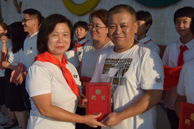 为新建中队辅导员颁发聘书并敬献红领巾。