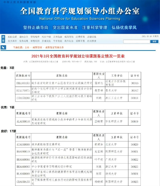 近日,石家庄外国语教育集团申报的国家社会科学基金“十三五”规划2016年度教育学一般课题“城乡教育均衡发展中山区教育扶贫实践模式研究”(项目编号:BHA160153)经全国教育科学规划办公室领导小组评审,课题研究成果符合免于鉴定条件,顺利结题。该课题是建国以来河北省第一个,也是唯一一个基础教育领域学校立项并顺利通过结项的国家教育科研课题,填补了河北省基础教育领域建国以来国家一般课题科研立项的空白。