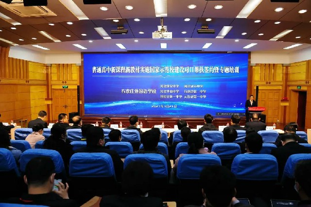为充分发挥示范校的示范引领、辐射带动作用,3月21日,石家庄外国语学校召开普通高中新课程新教材实施国家示范校建设对口帮扶签约暨专题培训会,与行唐、灵寿、平山、井陉、赞皇、元氏6个山区县的行唐县第一中学、河北灵寿中学、河北平山中学、井陉县第一中学、河北赞皇中学、元氏县第一中学开展对口三年帮扶。