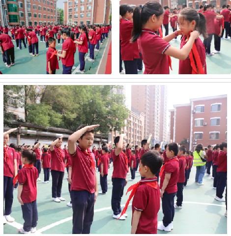 五年级老队员为一年级新队员佩戴红领巾。